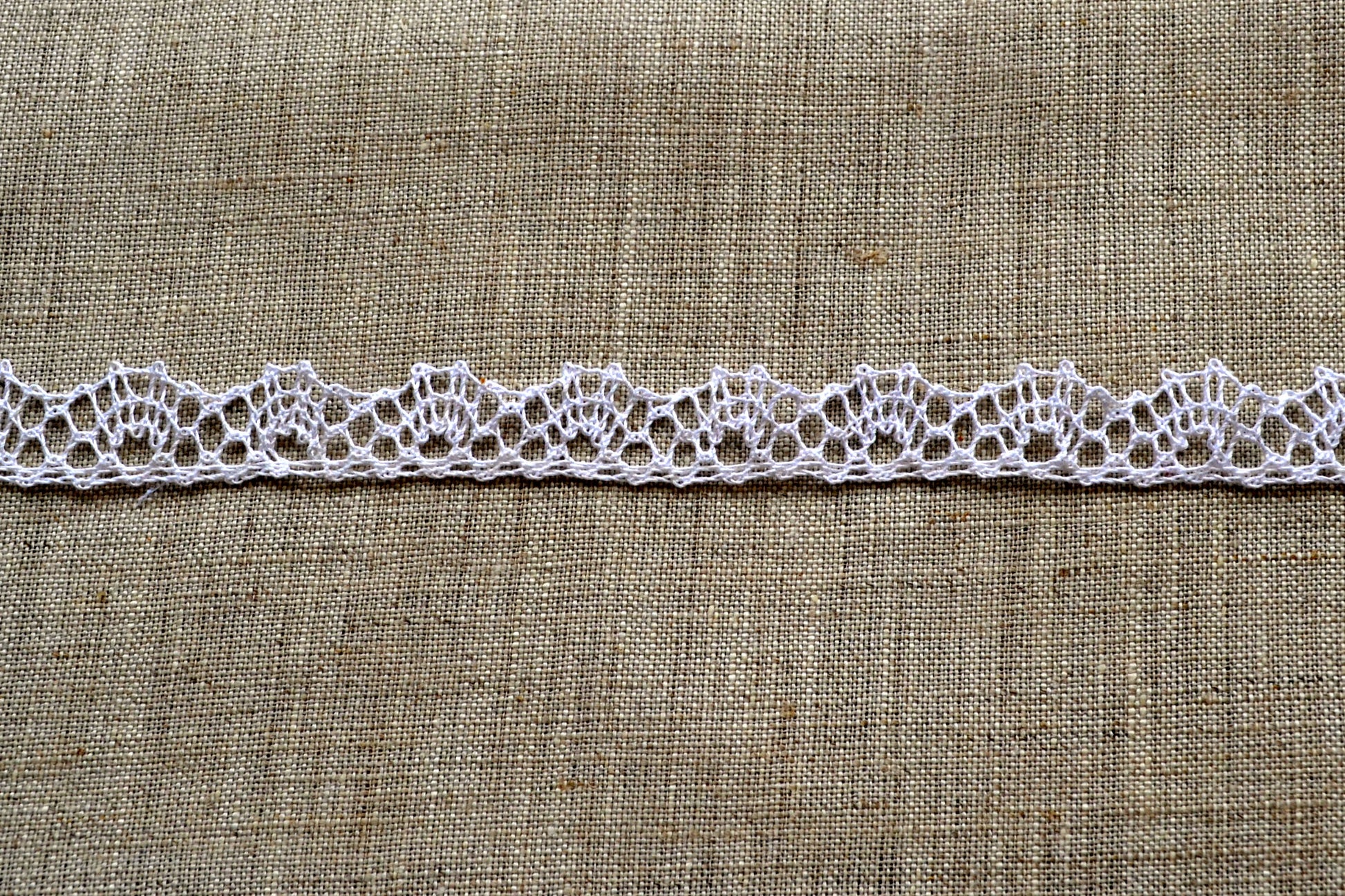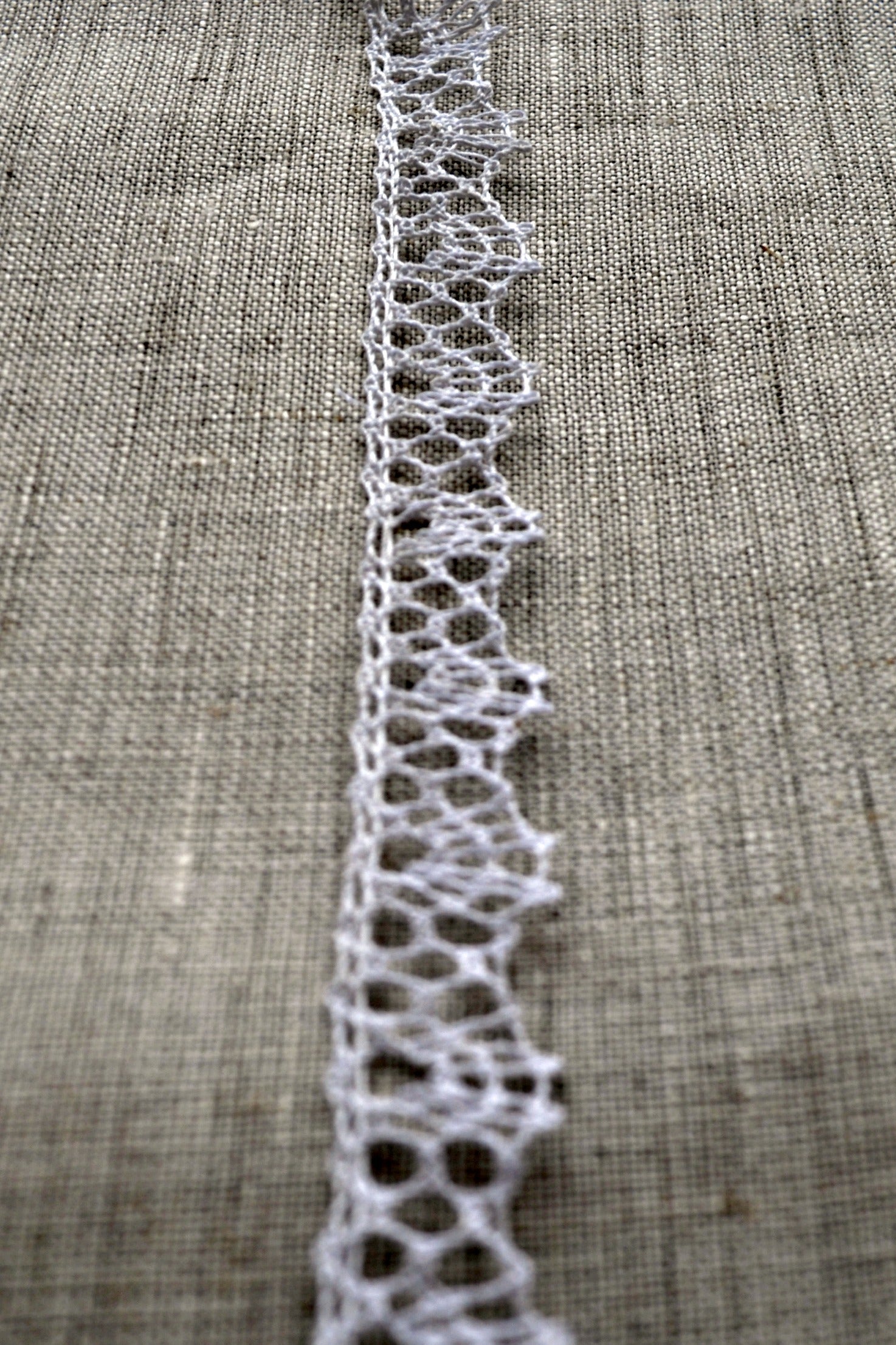 This lace border has a scalloped headside and a straight footside. It can be sewn down along the footside only as a trim, or along both sides to lay flat. This lace is half an inch wide at its widest point (the apex of the scallops) and measures approximately nine scallops per six inches. Your lace will be made all in one piece, unless otherwise asked for, and finished at both ends so as to not ravel. It may be cut to be used in projects.